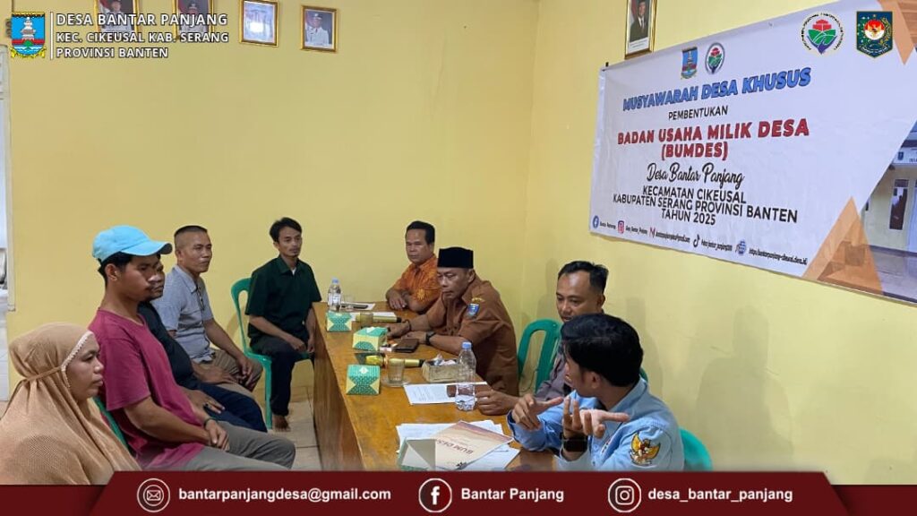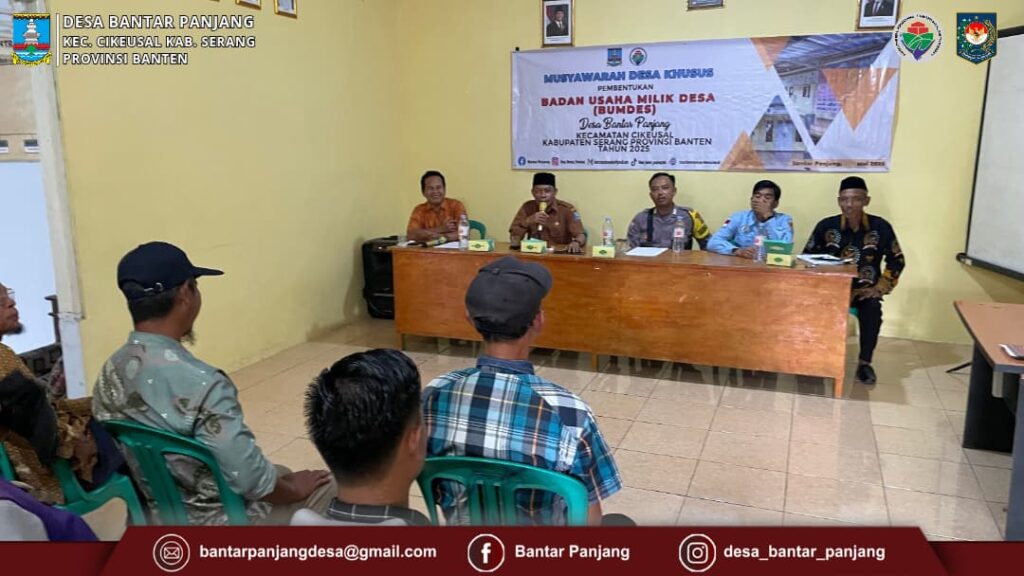 Senin, (26/05/2025). Bertempat di Aula Desa Bantar Panjang Melaksanakan Musyawarah Desa Khusus (Musdesus) Pembentukan Badan Usaha Milik Desa (BUMDES). Musdesus (Musyawarah Desa Khusus) pembentukan BUMDes adalah pertemuan yang diselenggarakan oleh Badan Permusyawaratan Desa (BPD) untuk membahas dan mengambil keputusan terkait pembentukan Badan Usaha Milik Desa (BUMDes). Musdesus ini penting untuk menyepakati berbagai aspek penting dalam pendirian BUMDes, seperti nama, unit usaha, struktur organisasi, dan anggaran dasar/anggaran rumah tangga (AD/ART).