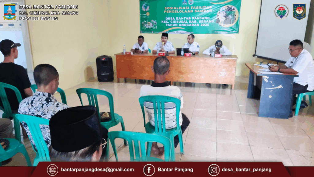 Rabu, (23/07/2025). Bertempat Di Aula Desa Bantar Panjang Pemerintah Desa Bantar Panjang melaksanakan Kegiatan Sosialisasi Fasilitas Pengelolaan Sampah Desa Kepada Ketua RT dan RW Se Desa Bantar Panjang. Narasumber Sosialisasi yakni dari Kecamatan Cikeusal Pak Sekmat M. Imanudin Mufti, S.P,di, MM dan Pak Ali Robayina S.E.